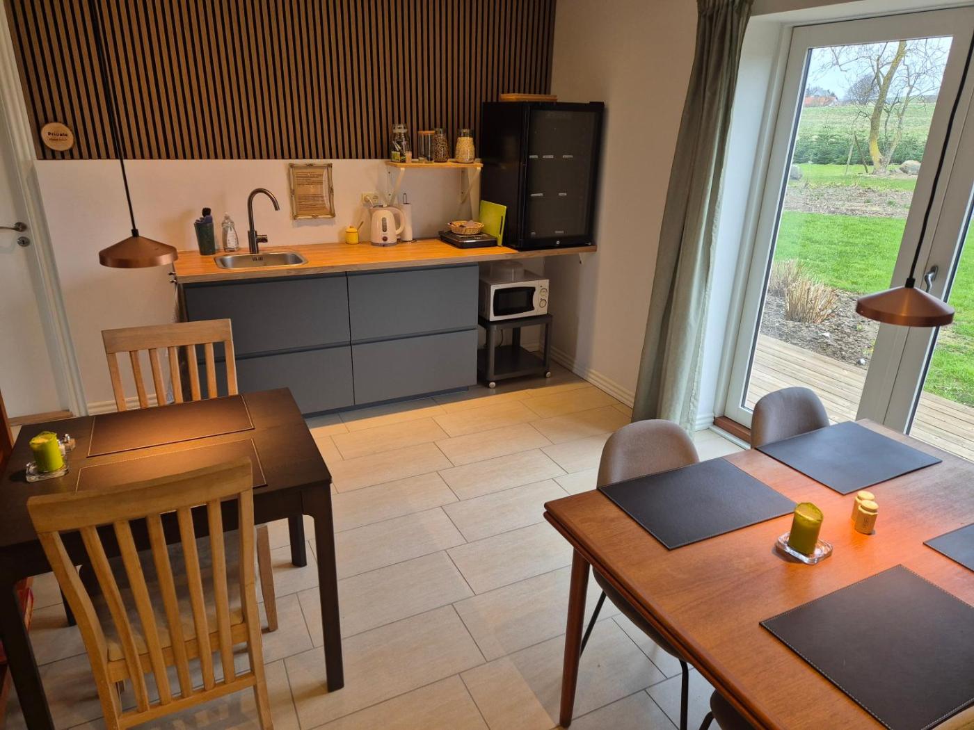 Twin Room with Garden View. The twin room offers a tea and coffee maker, a seating area, as well as a shared bathroom boasting a shower and a hairdryer. The kitchenette is fitted with a refrigerator, a microwave and a toaster. Among the room amenities are a dining area, a tiled floor, heating as well as an outdoor dining area and garden views. ;