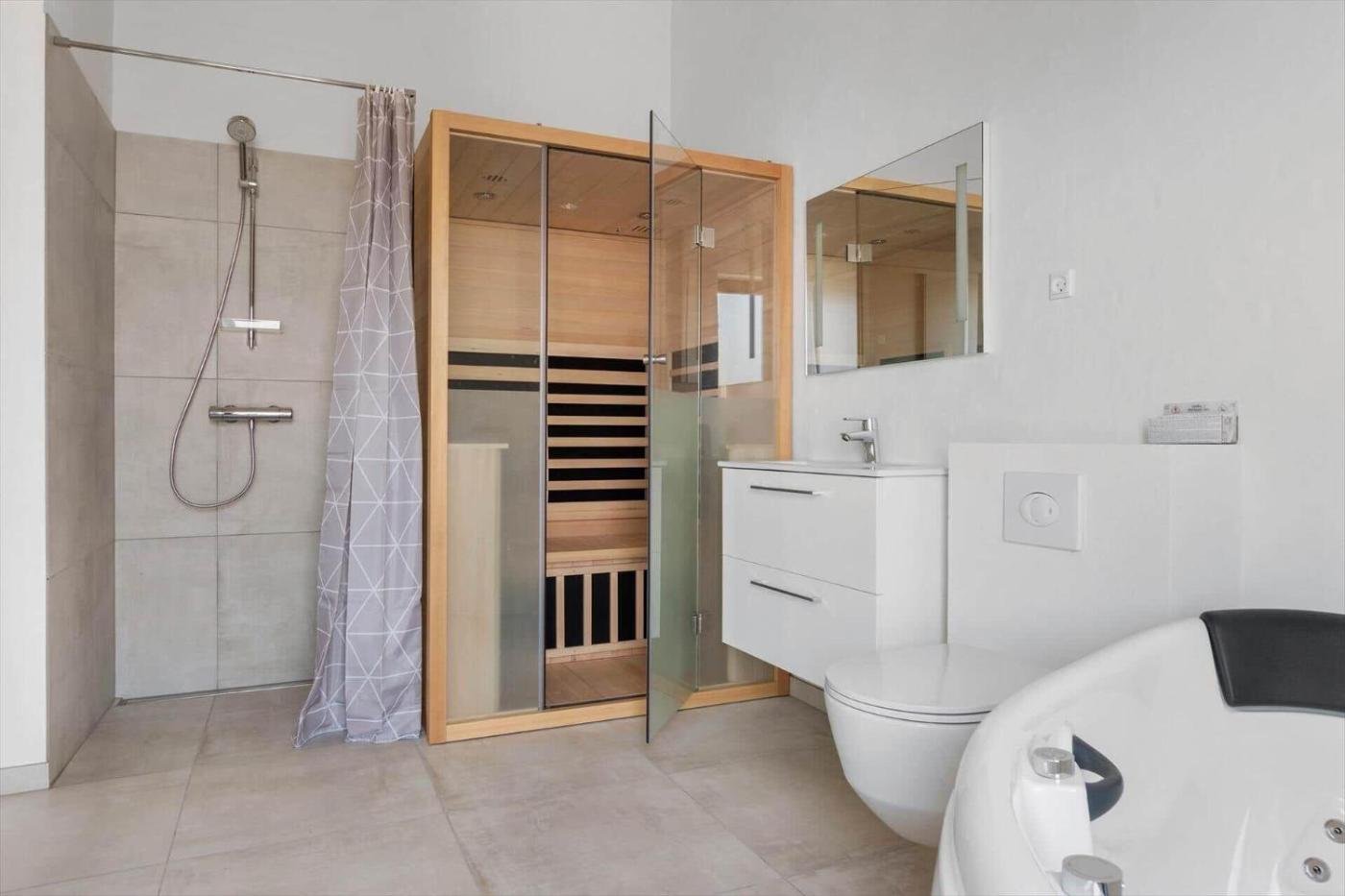 Holiday Home. This holiday home features a hot tub and a sauna. This spacious holiday home comes with 3 bedrooms, kitchenette, a terrace and 2 bathrooms with a shower. Guests will find a stovetop, a refrigerator, a dishwasher and an oven in the kitchenette. The holiday home also includes a barbecue. Boasting outdoor furniture, this holiday home also features a washing machine, a tea and coffee maker and a TV. The unit has 3 beds.